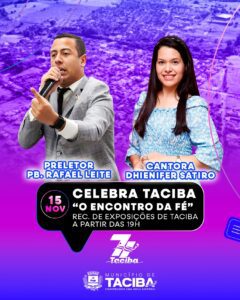 É no próximo sábado, 15 de novembro, no Recinto de Exposições de Taciba, a partir das 19h, “Celebra Taciba – O encontro da fé”. Pela primeira vez, evento ecumênico em celebração aos 71 anos de Taciba.