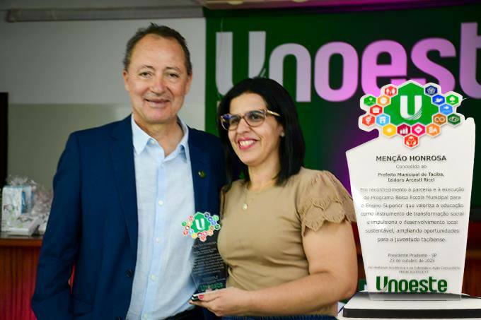 O prefeito Izidoro também recebeu menção honrosa, em reconhecimento à parceria e à execução do programa Bolsa Escola Municipal para o Ensino Superior, ampliando oportunidades para a juventude tacibense.