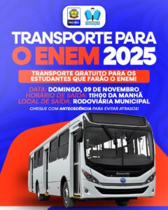 A Secretaria Municipal de Educação informa que será disponibilizado transporte gratuito para os alunos que irão participar da prova do ENEM.